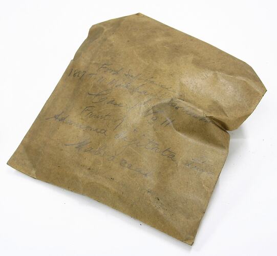 Sample envelope containing fruit from the Adansonia digitata (bombacaceae) - Boabab Tree. This was collected and prepared by T.N.Mukharji as part of his work for the Indian Botanical Gardens. It was donated to the Museum by the Indian Government, Culcutta in 1887.