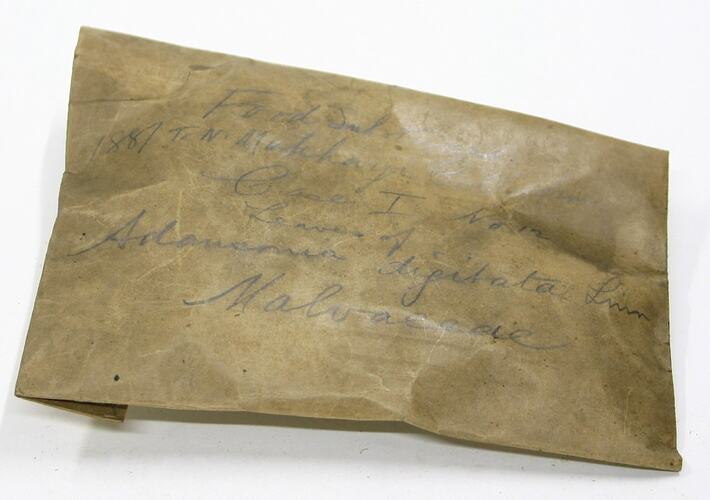 Sample envelope containing fruit from the Adansonia digitata (bombacaceae) - Boabab Tree. This was collected and prepared by T.N.Mukharji as part of his work for the Indian Botanical Gardens. It was donated to the Museum by the Indian Government, Calcutta in 1887.