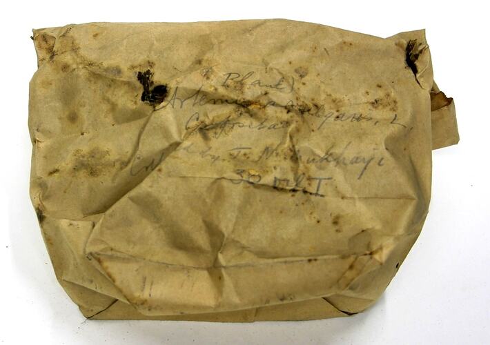 Plant specimens contained in a brown paper bag with a description of the contents handwritten in pencil.