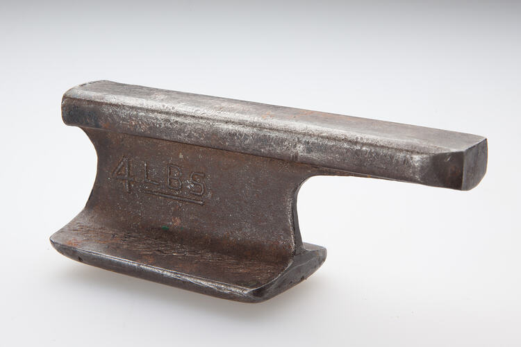 Small metal anvil (or Lap Iron or Hammer Iron) used by Sandor Sabo while he was making or repairing shoes. It was used by Mr Sabo on his lap, held between his legs, to hammer nails and wooden pegs, and to hammer and shape leather. It was made in Yugoslavia. Hammering of leather was superseded by rolling machines in the 20th century, suggesting that Mr Sabo was a craftsman whose business wasn't big or permanent enough to warrant a large machine.