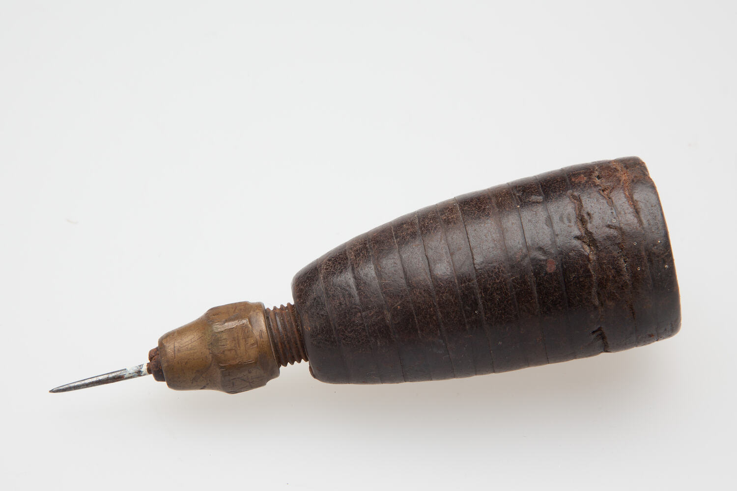 Leather handled awl or Peg awl, used by Sandor Sabo while he was making or repairing shoes. Awls are used to pierce holes in leather when sewing. This type of awl was mostly used for patching leather, although sometimes used to sew the upper together. It may also have been used to make holes for wooden pegs which were used to attach parts of the shoe.