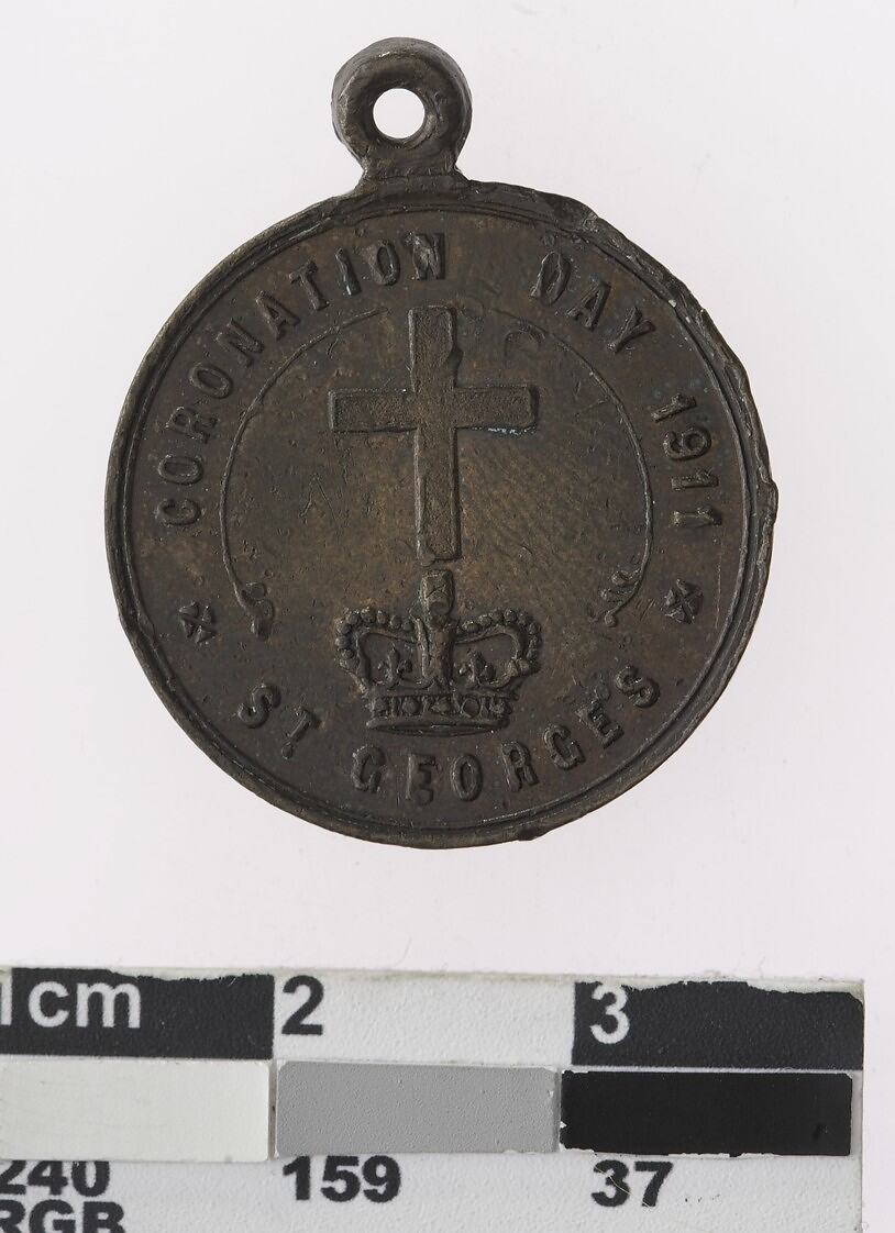 In centre, cross with crown below. around, CORONATION DAY 1911 / ST GEORGE'S