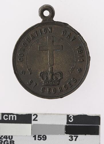 Obverse: In centre, busts of George V and Mary. Around , CORONATION GEORGE V AND MARY , 1911 . Reverse: In centre, cross with crown below. around, CORONATION DAY 1911 / ST GEORGE'S