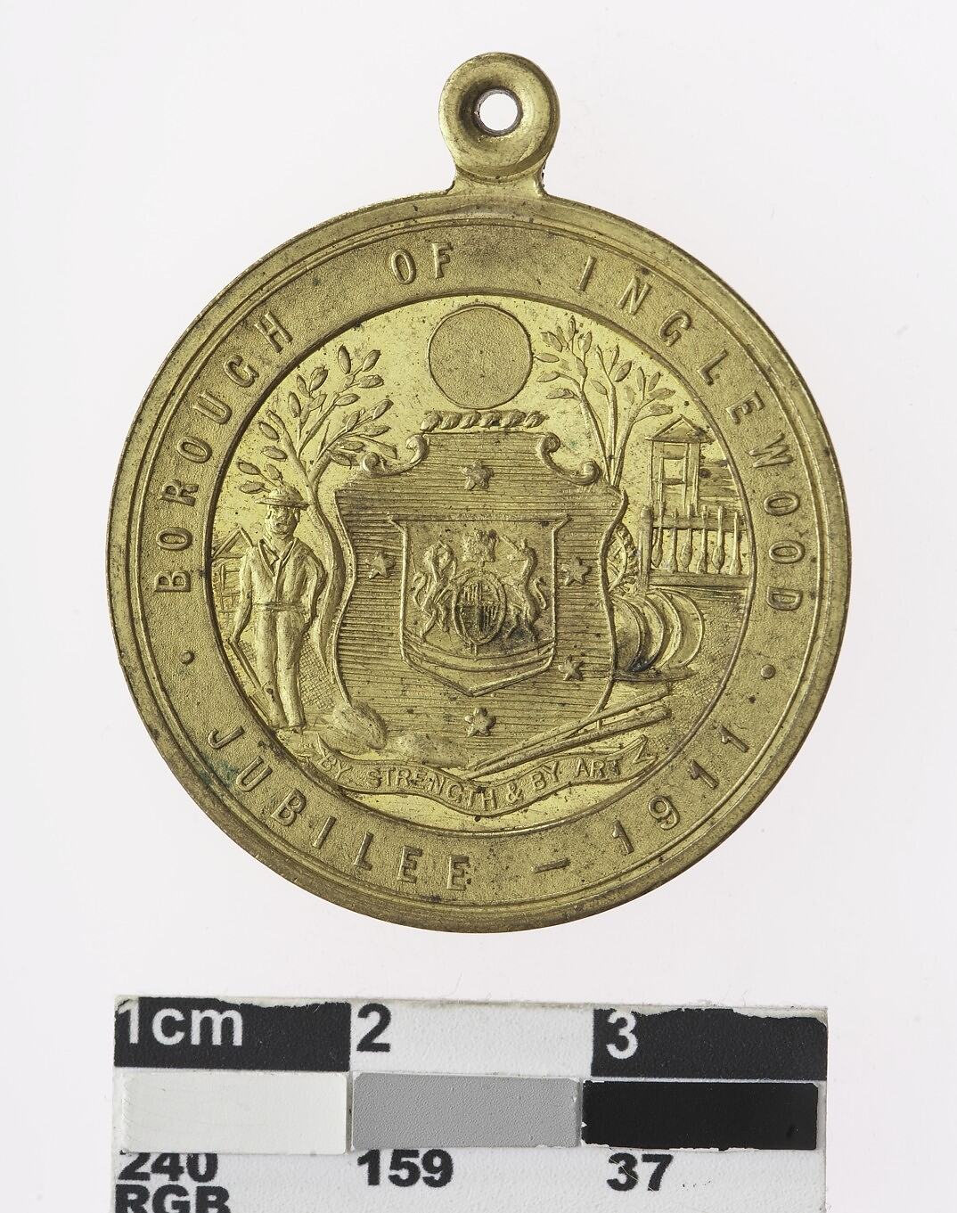 Obverse: In centre, busts of George V and Mary. Around , CORONATION, GEORGE V & MARY , 1911 . Reverse: In centre, coat of arms on shield. At left, a man, probably a miner, standing with shovel next to tree. At right, equipment with building and tree in background, probably relating to eucalyptus distillery. Beneath, BY STRENGTH & BY ART. Around, BOROUGH OF INGLEWOOD / JUBILEE - 1911.