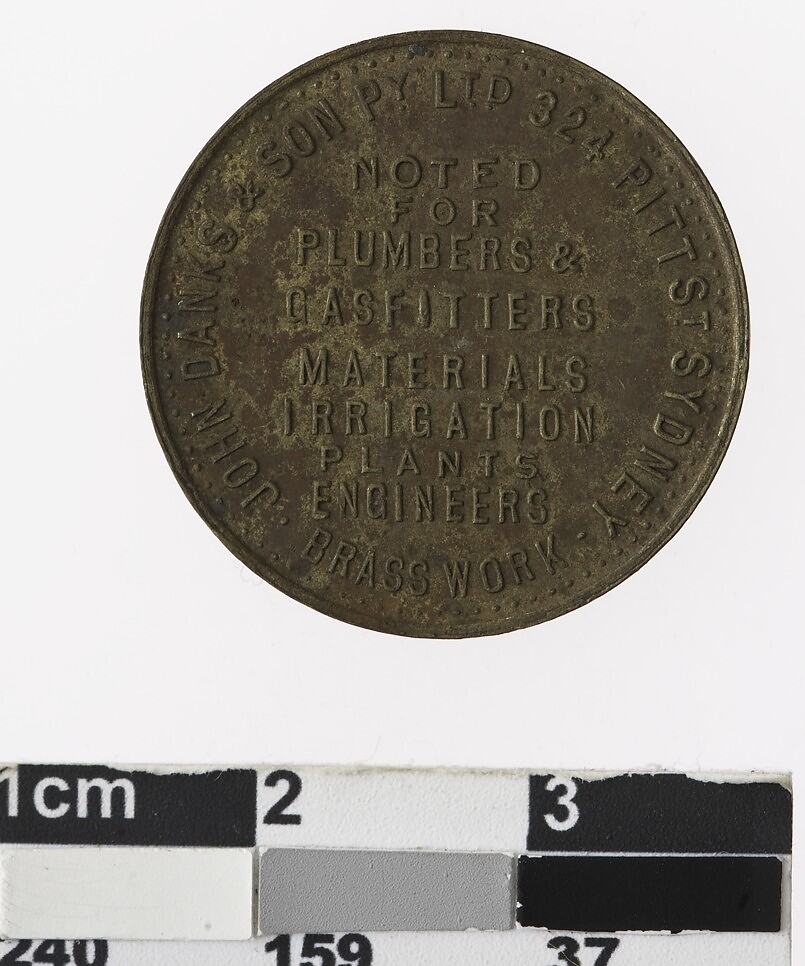 Obverse: In centre, heads of George V and Mary. Around , JOHN DANKS & SON PY. LTD. CORONATION MEDAL 1911 . Reverse: In centre, NOTED / FOR/ PLUMBERS & GASFITTERS/MATERIALS/IRRIGATION/PLANTS/ENGINEERS. Around: JOHN DANKS & SON PY. LTD. 324 PITT ST SYDNEY BRASS WORK