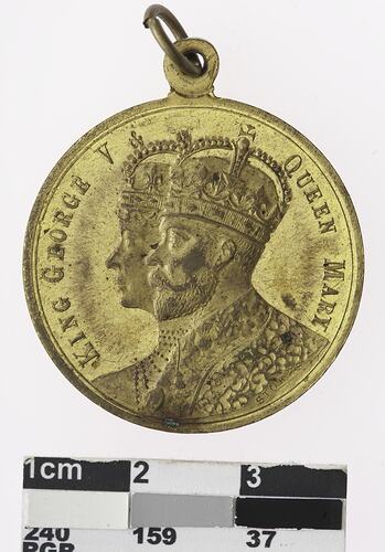 Medal with metal ring through loop. Obverse: In centre, busts of George V and Mary. Around , KING GEORGE V & QUEEN MARY /STOKES Reverse: In centre, coat of arms of Victoria. Around, TO COMMEMORATE THEIR MAJESTIES' CORONATION JUNE 22, 1911/VICTORIA. Figure on left of shield is holding a branch which differs slightly from the other version of this medal. This version is the large branched variety.