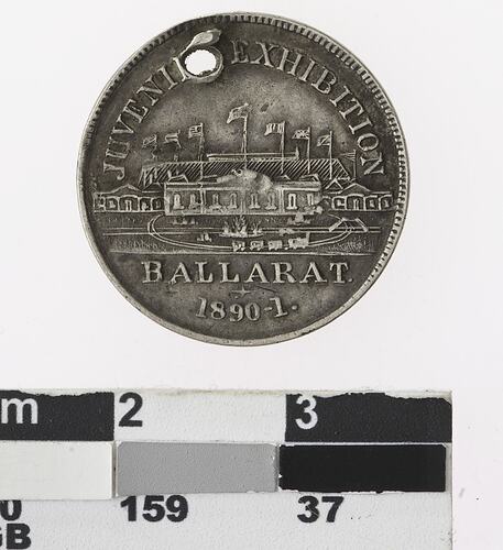 Obverse: In centre , building with flags , with railway running through foreground. Around: JUVENILE EXHIBITION / BALLARAT / 1890-1 Reverse: Coat of arms of Australia. Around: EXHIBITION SOUVENIR Medal has hole punched out off-centre. This has obscured some of the inscription and has bent the medal.