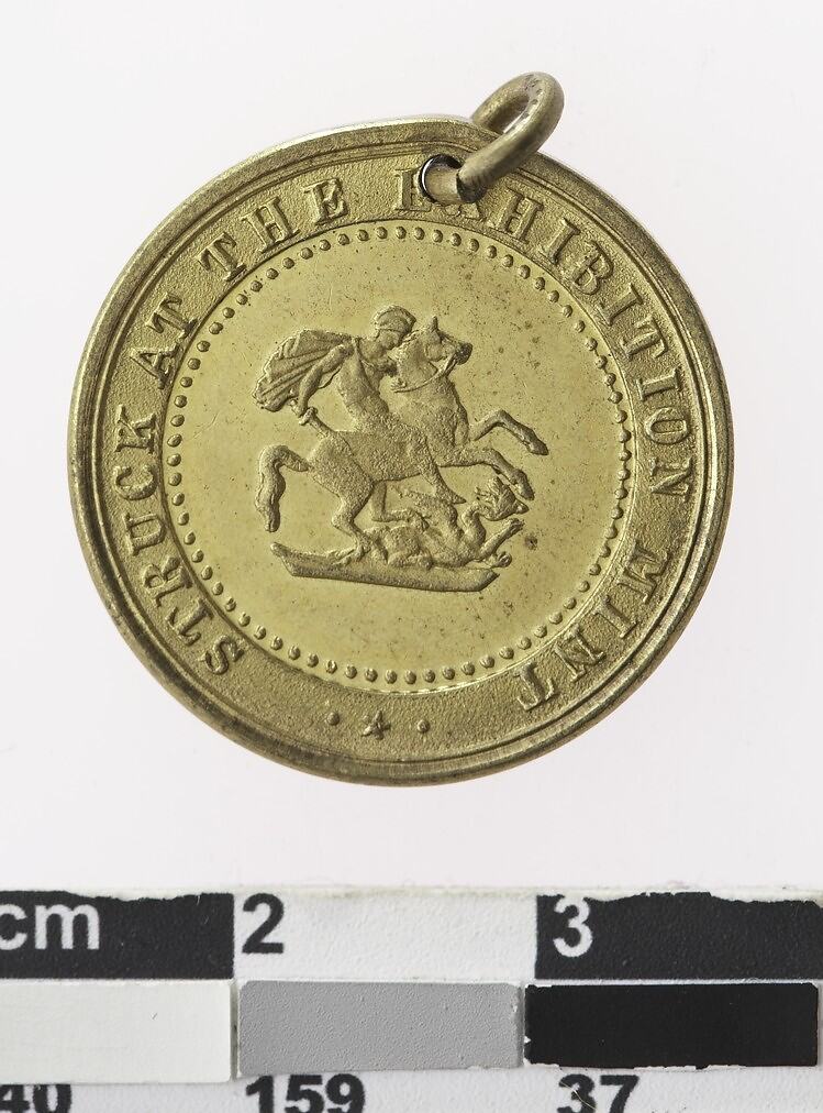 In centre, St George on horseback defeating the dragon. Around: STRUCK AT THE EXHIBITION MINT