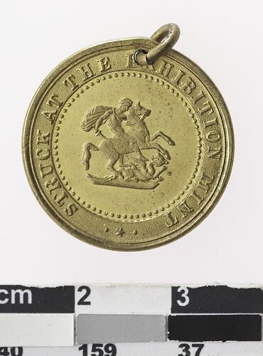 Small gilt medal holed and with loop for wearing. Obverse: In centre, Tasmanian Exhibition Building. Around: TASMANIAN EXHIBITION / HOBART / 1894-5 Reverse: In centre, St George on horseback defeating the dragon. Around: STRUCK AT THE EXHIBITION MINT