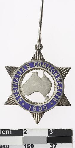 Sterling silver and enamel badge minted by Stokes & Sons, Melbourne in 1899. The badge would have been worn by a supporter of Federation. Although the Commonwealth of Australia Constitution Act had passed both houses of the British Parliament, it was not certain that all six colonies would join the Federation. Each colonial Parliament had to pass legislation agreeing to become part of the Commonwealth, and then hold referenda. In 1899 referenda were held in Victoria, New South Wales, Tasmania, South Australia and Queensland. Western Australia held a referendum in 1900.