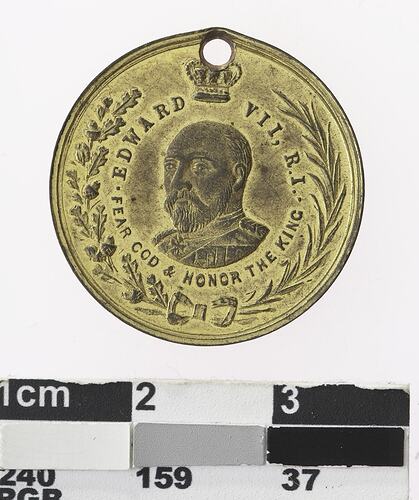 Gilt bronze medal, holed for wearing. Obverse: Bust of Edward VII. Crown above and wreath around. Around: EDWARD VII * R.I * FEAR GOD AND HONOUR THE KING Reverse : In centre, building. Around: EXHIBITION BENDIGO 1901 / GOLD JUBILEE. To left and right of clock tower engraved initials J A