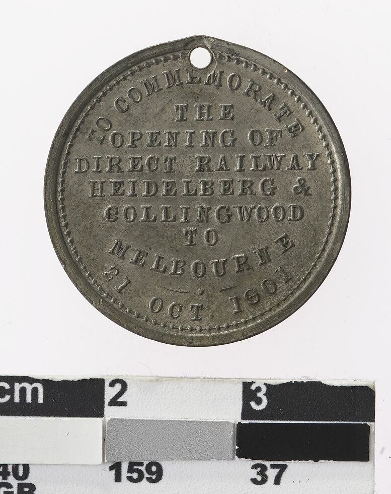 TO COMMEMORATE /THE OPENING OF / DIRECT RAILWAY /HEIDELBERG & COLLINGWOOD/TO MELBOURNE/21 OCT. 1901