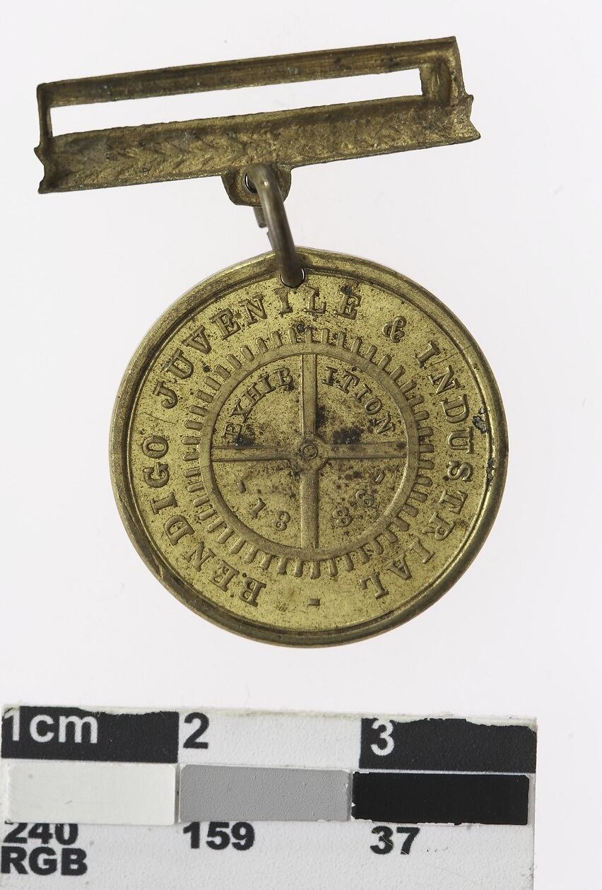 Medal has a decorative bar. Obverse: In centre : Sandhurst (Bendigo) Town Hall; around: TOWN HALL / SANDHURST. Below: STOKES & MARTIN Reverse: Gear wheel. Around: BENDIGO JUVENILE & INDUSTRIAL; within wheel: EXHIBITION 1886.