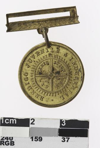 Gear wheel. Around: BENDIGO JUVENILE & INDUSTRIAL. Within wheel: EXHIBITION 1886.