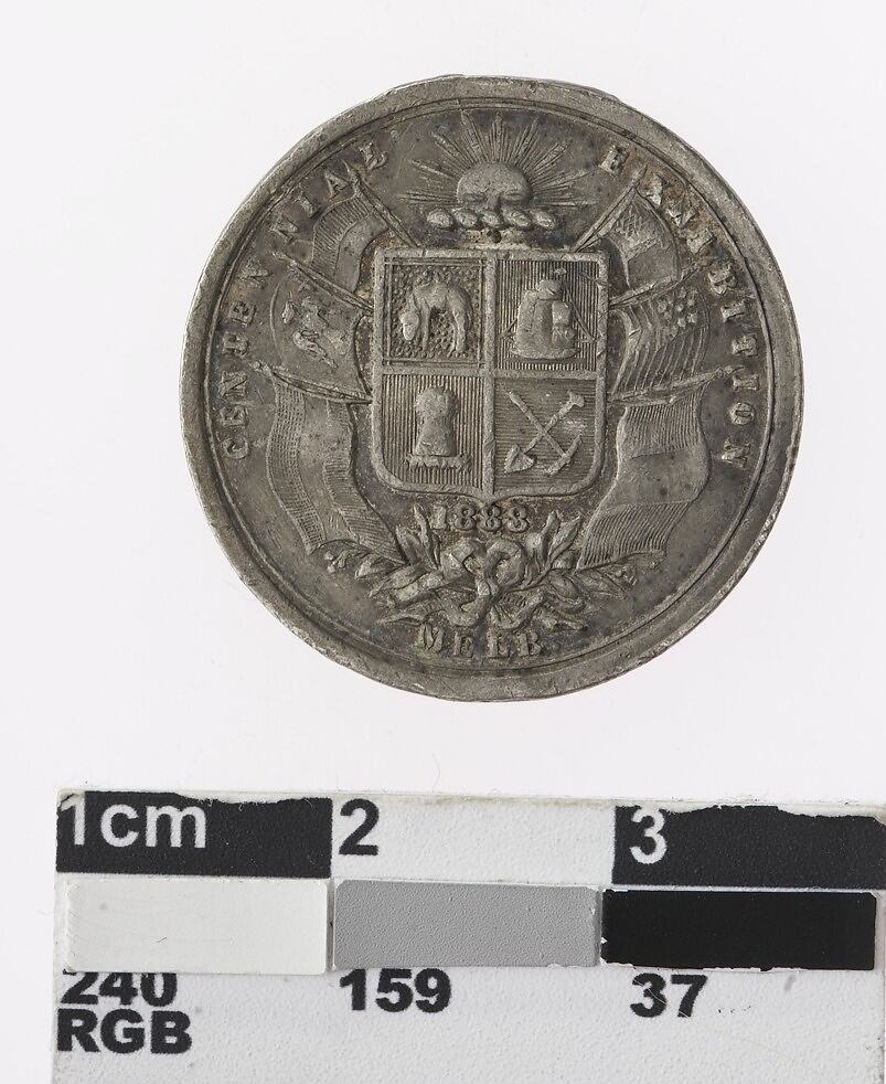 Obverse: In centre : Head of Queen Victoria; around. AUSTRALIA'S CENTENARY. Reverse: Coat of arms, with three flags either side and radiate sun above. Around: CENTENNIAL EXHIBITION / MELB. Beneath shield : 1888.