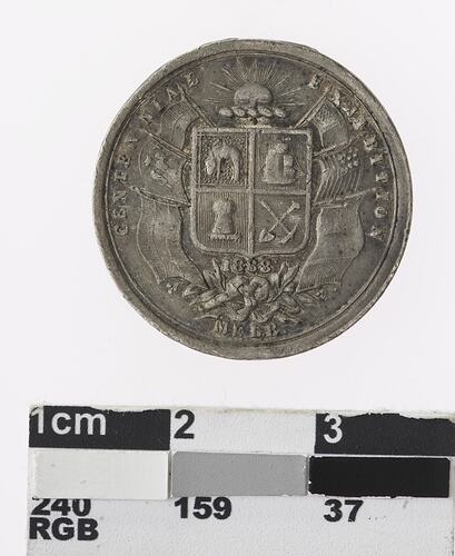 Coat of arms, with three flags either side and radiate sun above. Around: CENTENNIAL EXHIBITION/MELB. Beneath shield : 1888.