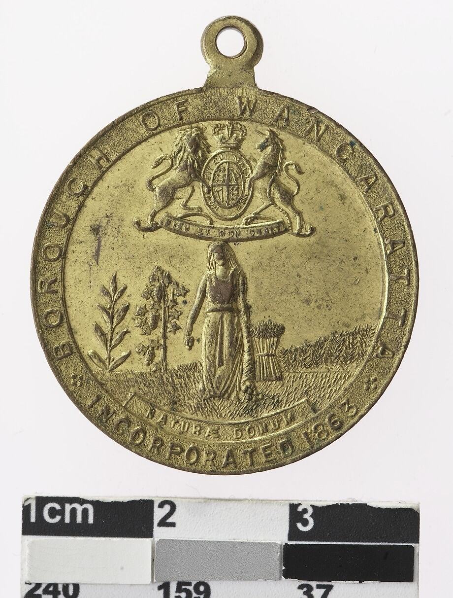 Above, coat of arms (Of Britain). woman in long dress in field, holding a cornucopia. Plants behind include grapevine, grain and possibly tobacco. Around: BOROUGH OF WANGARATTA * INCORPORATED 1863 *,