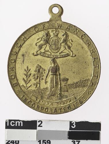 Obverse: Above, coat of arms (Of Britain). woman in long dress in field, holding a cornucopia. Plants behind include grapevine, grain and possibly tobacco; around: BOROUGH OF WANGARATTA * INCORPORATED 1863 *, Reverse: HONOR / .THE. / BRAVE /.../ WORLD WAR / 1939-1945. Wreath around.