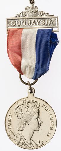 Red, white and blue ribbon and bar inscribed SUNRAYSIA. Pin is attached to bar. Obverse: Head of Elizabeth II; around, QUEEN ELIZABETH II / STOKES Reverse: CORONATION AUSTRALIA / 2nd JUNE 1953