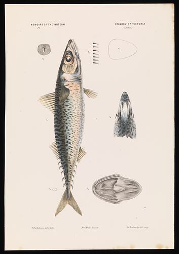 Blue Mackerel, Scomber australasicus Cuvier, in Cuvier & Valenciennes, by Arthur Bartholomew (del & lith). Lithographic proof A - lithographic ink on paper, 19cm x 28cm . Published as plate 28 in The Prodromus of the Zoology of Victoria by Frederick McCoy.