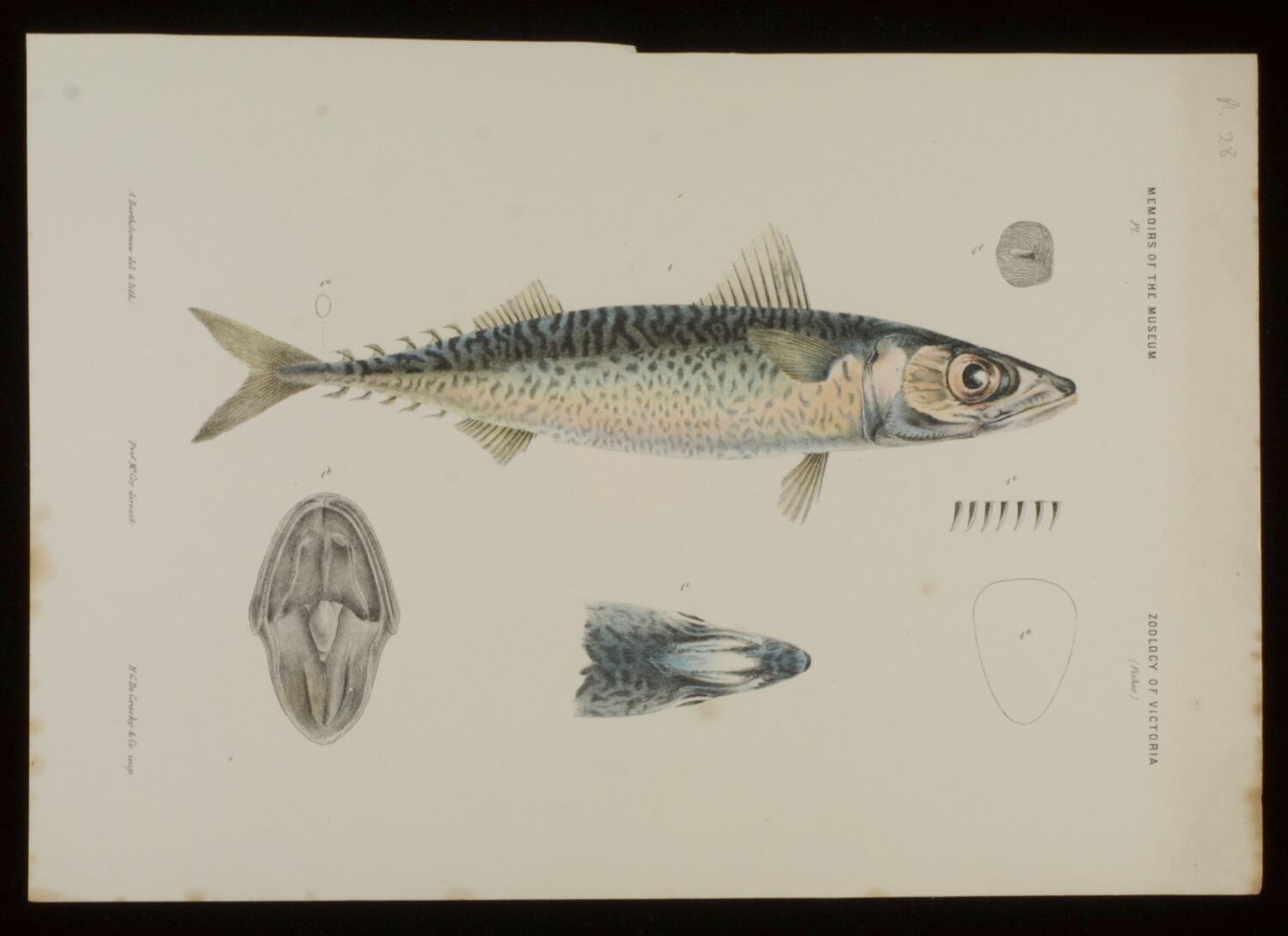 Blue Mackerel, Scomber australasicus Cuvier, in Cuvier & Valenciennes, by Arthur Bartholomew (del & lith). Lithographic proof B - lithographic ink and pencil on paper, 19cm x 28cm . Published as plate 28 in The Prodromus of the Zoology of Victoria by Frederick McCoy.