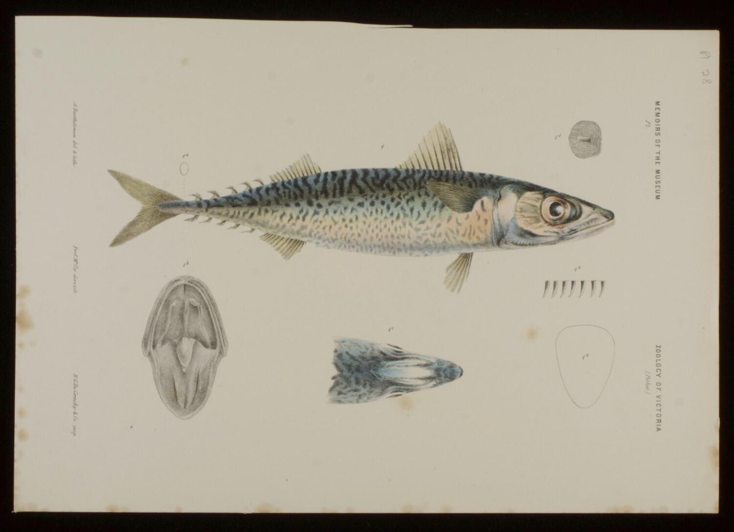 Blue Mackerel, Scomber australasicus Cuvier, in Cuvier & Valenciennes, by Arthur Bartholomew (del & lith). Lithographic proof C - lithographic ink and pencil on paper, 19cm x 28cm . Published as plate 28 in The Prodromus of the Zoology of Victoria by Frederick McCoy.