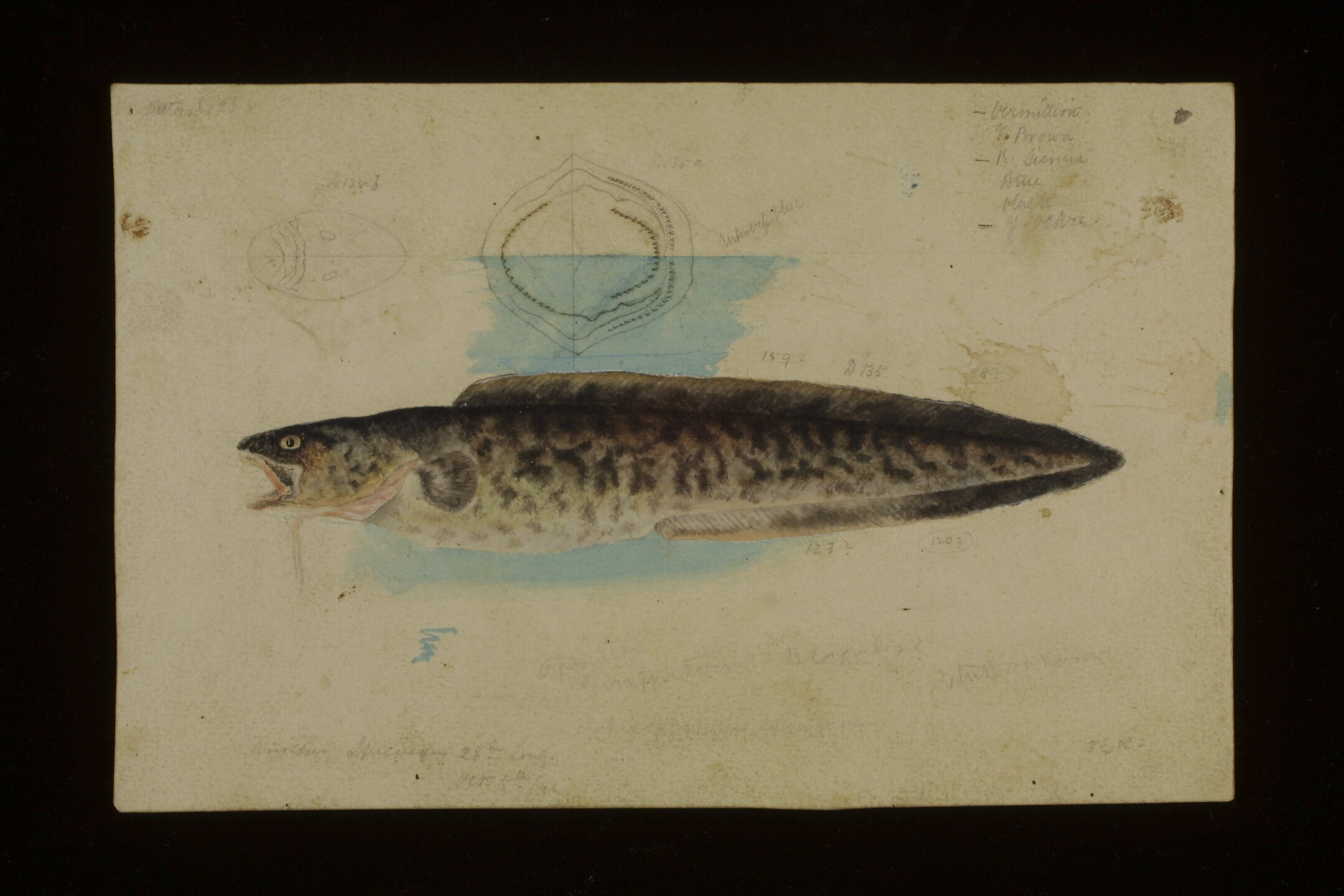 Rock Ling, Genypterus tigerinus Klunzinger by Arthur Bartholomew (del & lith). Drawing 135 - Pencil, watercolour and Ink on Paper, 16 cm x 25cm. Published as plate 27 in The Prodromus of the Zoology of Victoria by Frederick McCoy.