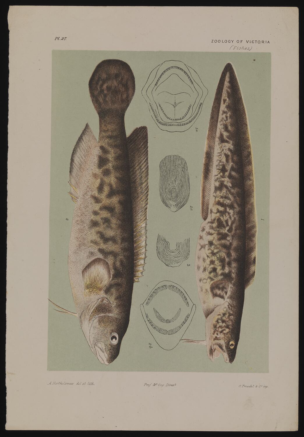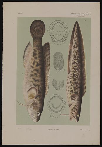 Rock Ling, Genypterus tigerinus Klunzinger AND River Blackfish, Gadopsis marmoratus (Richardson) by Arthur Bartholomew (del & lith). Colour Proof B - lithographic ink on paper, 19cm x 28cm . Published as plate 27 in The Prodromus of the Zoology of Victoria by Frederick McCoy.
