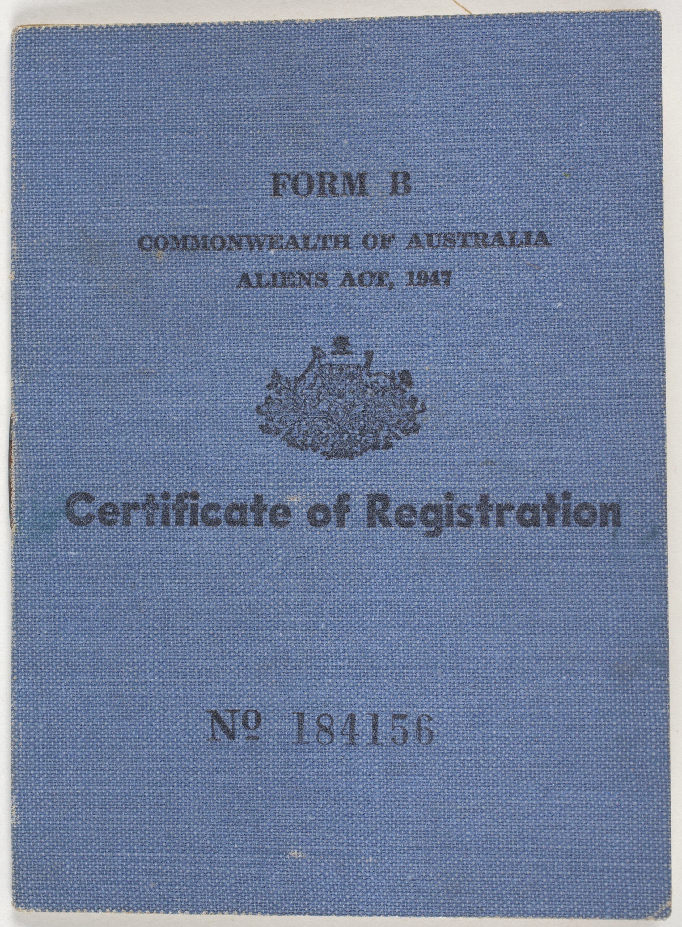 FORM B/COMMONWEALTH OF AUSTRALIA/ALIENS ACT, 1947/Certificate of Registration/No 184156