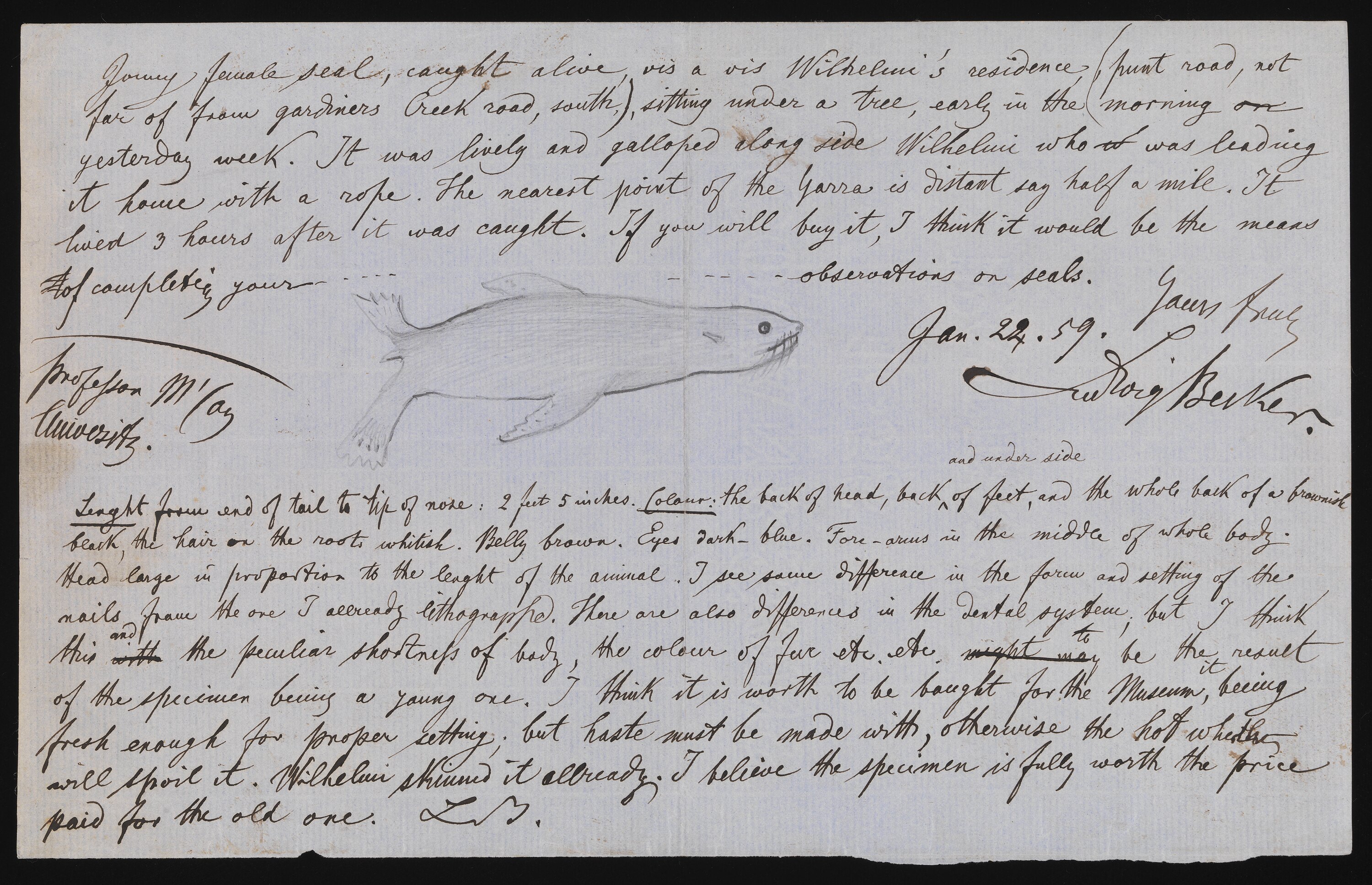 Letter from Ludwig Becker to Frederick McCoy, Director of the National Museum of Victoria, on finding a young female Australian Fur Sea alive on Punt Road near Gardiners Creek Road, Melbourne. Becker included a sketch of the seal, and suggested that McCoy purchase the animal to complete his observations on seals. The information in Becker's letter is associated with the publication of Plate 31 in The Prodromus of the Zoology of Victoria by McCoy.