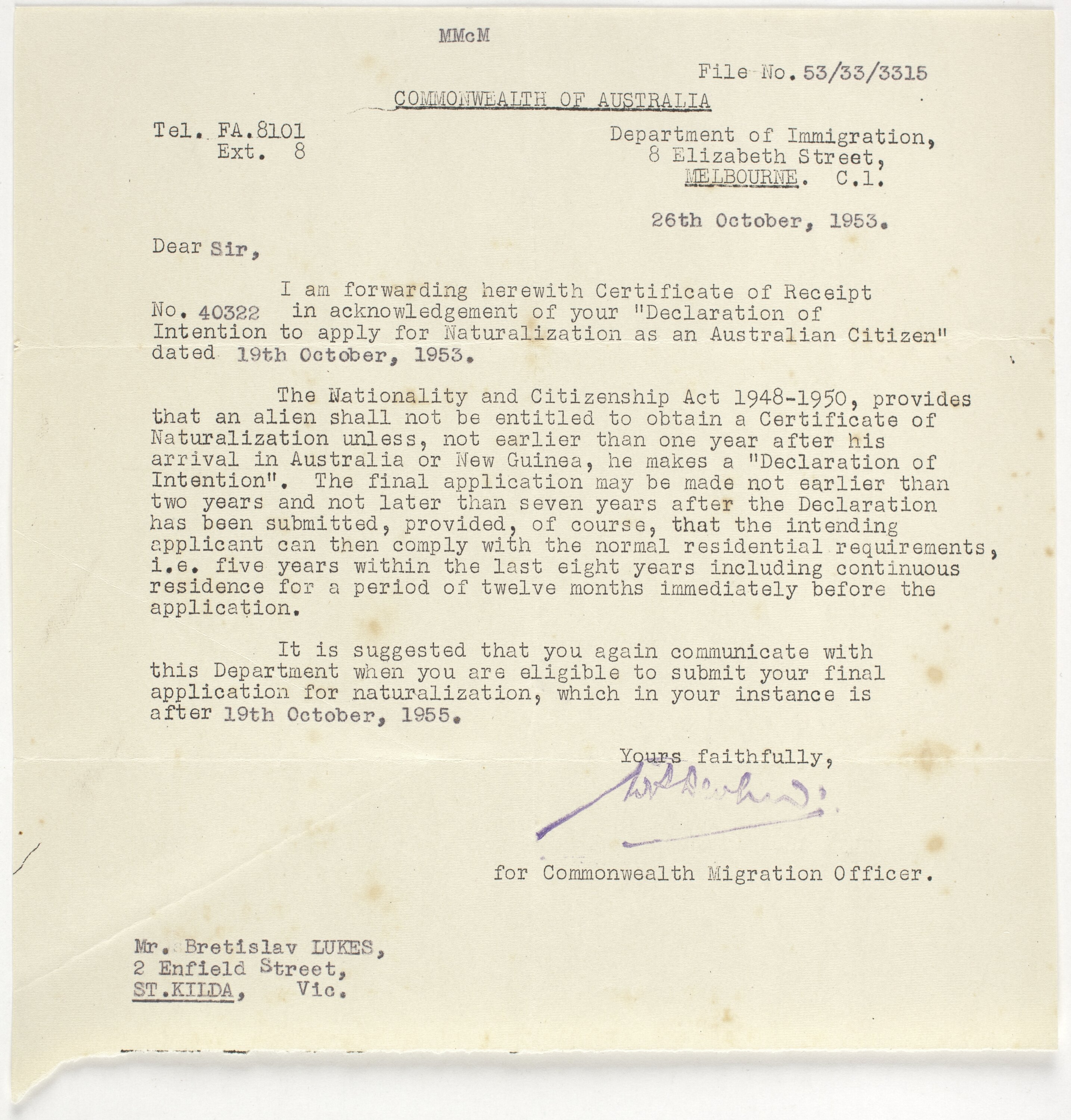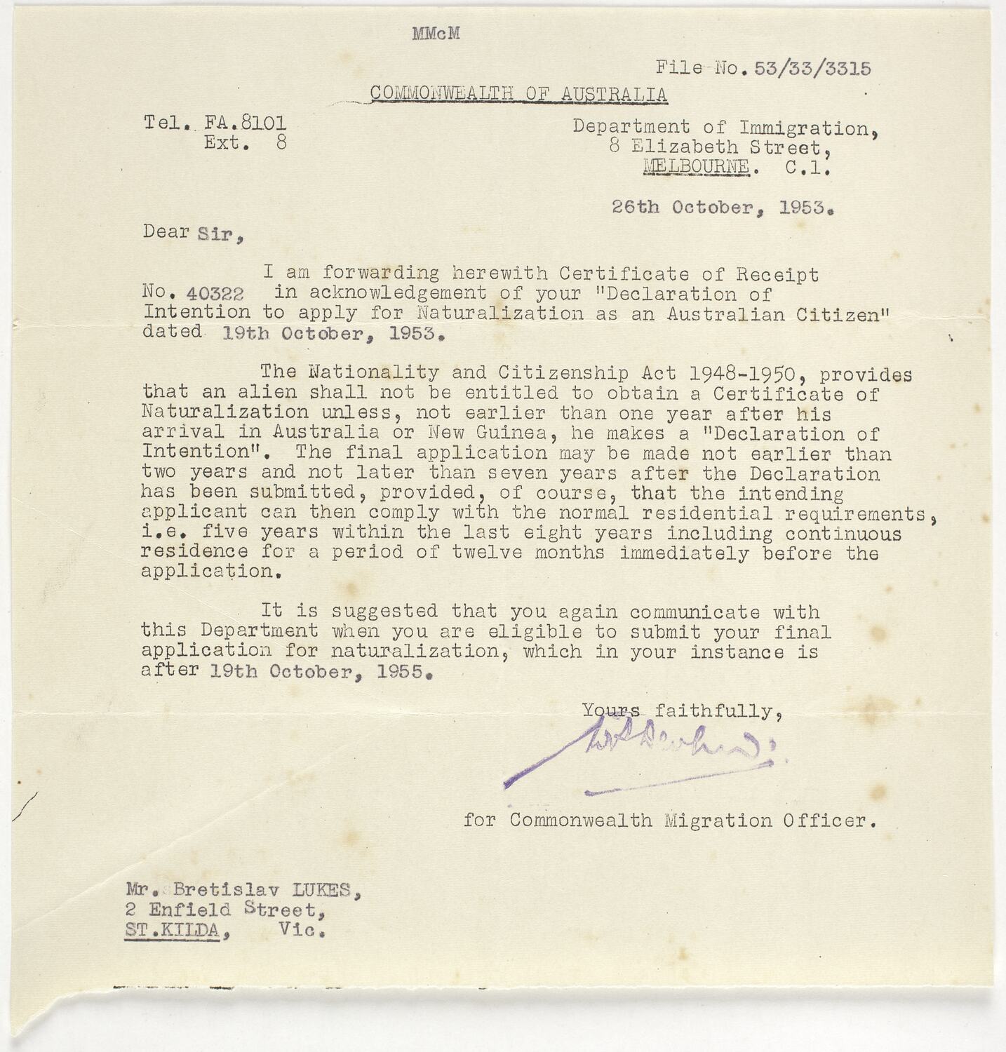 Letter from Department of Immigration, Melbourne, to Bretislav Lukes, dated 26 October 1953. The letter acknowledges the receipt of a 'Declaration of Intention to Apply for Naturalization as an Australian Citizen'. Born 12 January 1922 in Stankou in Czechoslovakia, Bretislav claims to have worked for the Germans during the war in Junkers aircraft factory. He migrated to Australia in 1950 after spending time in an IRO camp following World War Two. Sent to Bonegilla upon arrival, Bretislav completed his compulsory employment at Australian Iron and Steel at Port Kembla, probably on the Snowy Hydro-electric Scheme. When his two year labour contract was completed he moved to Melbourne where he lived for the rest of his life, although he did return to Czechoslovakia and other parts of Europe to visit friends and family.