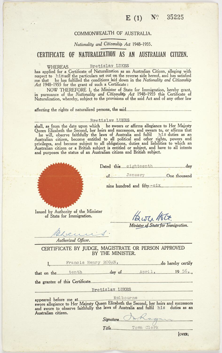 Naturalization certificate issued by the Commonwealth of Australia to Bretislav Lukes on 18 January 1956. Born 12 January 1922 in Stankou in Czechoslovakia, Bretislav claims to have worked for the Germans during the war in Junkers aircraft factory. He migrated to Australia in 1950 after spending time in an IRO camp following World War Two. Sent to Bonegilla upon arrival, Bretislav completed his compulsory employment at Australian Iron and Steel at Port Kembla, probably on the Snowy Hydro-electric Scheme. When his two year labour contract was completed he moved to Melbourne where he lived for the rest of his life, although he did return to Czechoslovakia and other parts of Europe to visit friends and family.