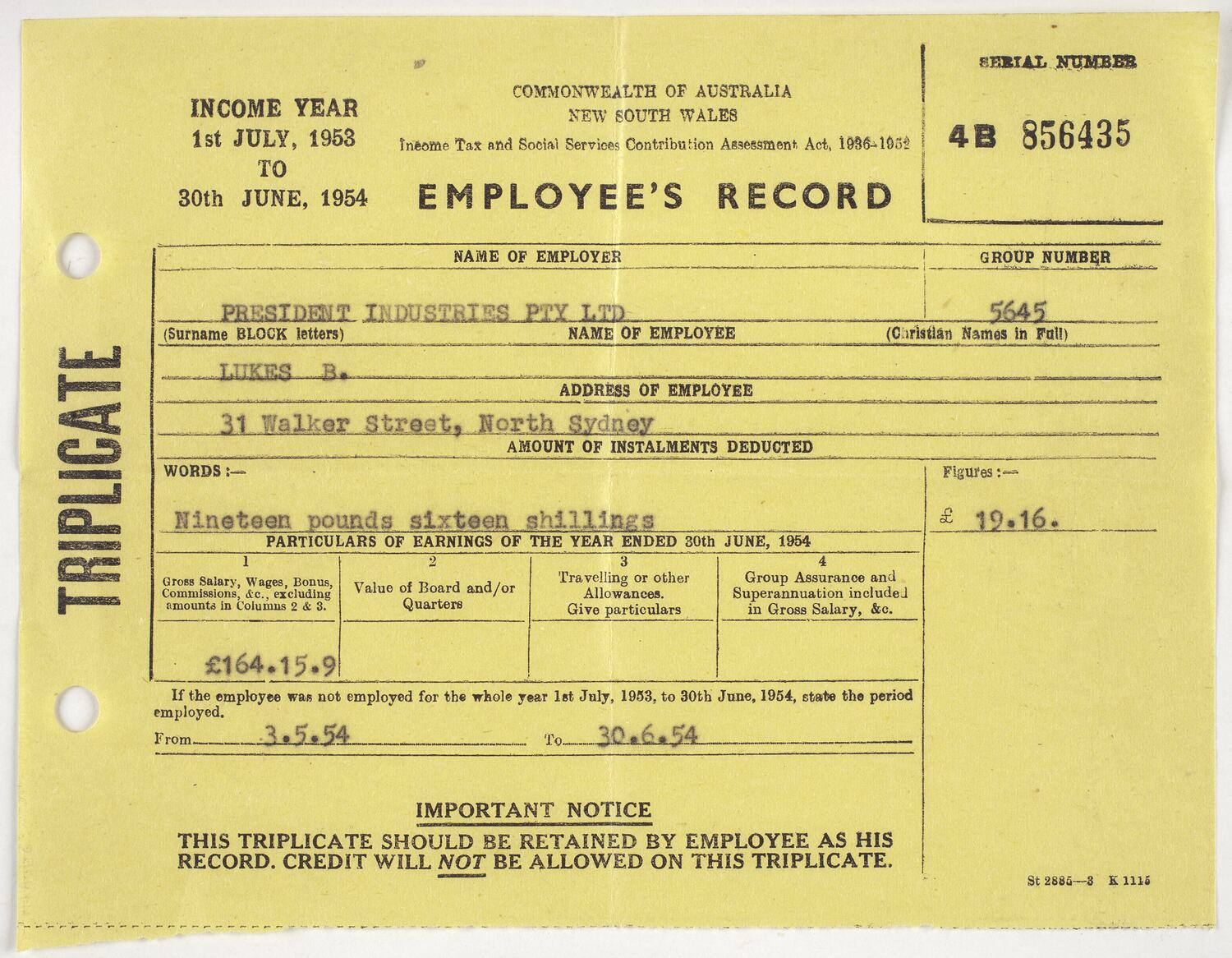 Group certificate issued by President Industries Pty Ltd, Sydney to Bretislav Lukes for the period May-June 1954. Born 12 January 1922 in Stankou in Czechoslovakia, Bretislav claims to have worked for the Germans during the war in Junkers aircraft factory. He migrated to Australia in 1950 after spending time in an IRO camp following World War Two. Sent to Bonegilla upon arrival, Bretislav completed his compulsory employment at Australian Iron and Steel at Port Kembla, probably on the Snowy Hydro-electric Scheme. When his two year labour contract was completed he moved to Melbourne where he lived for the rest of his life, although he did return to Czechoslovakia and other parts of Europe to visit friends and family.