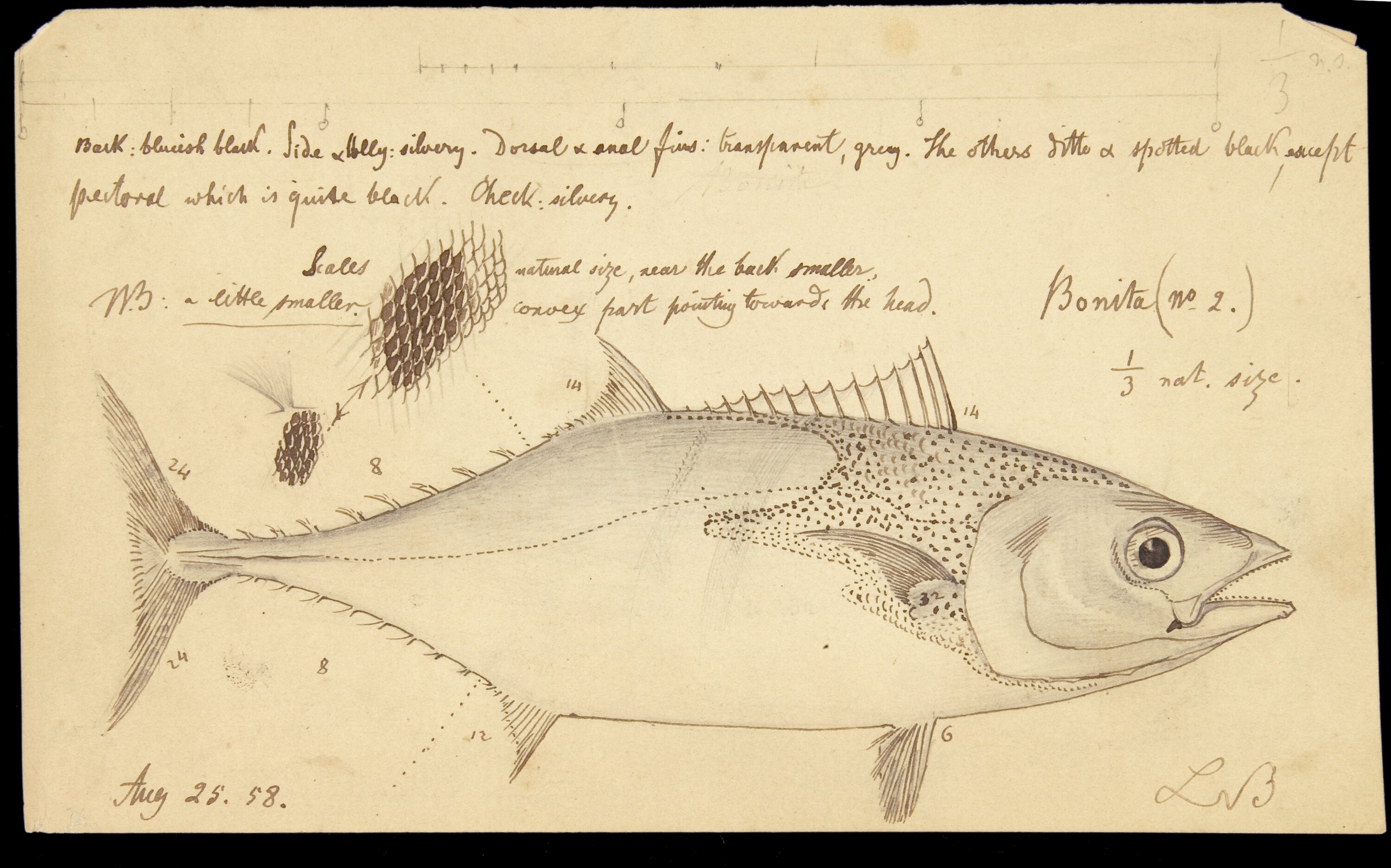 Aug 25. 58. / L B / 1/3rd nat size. Bonita (1.).
