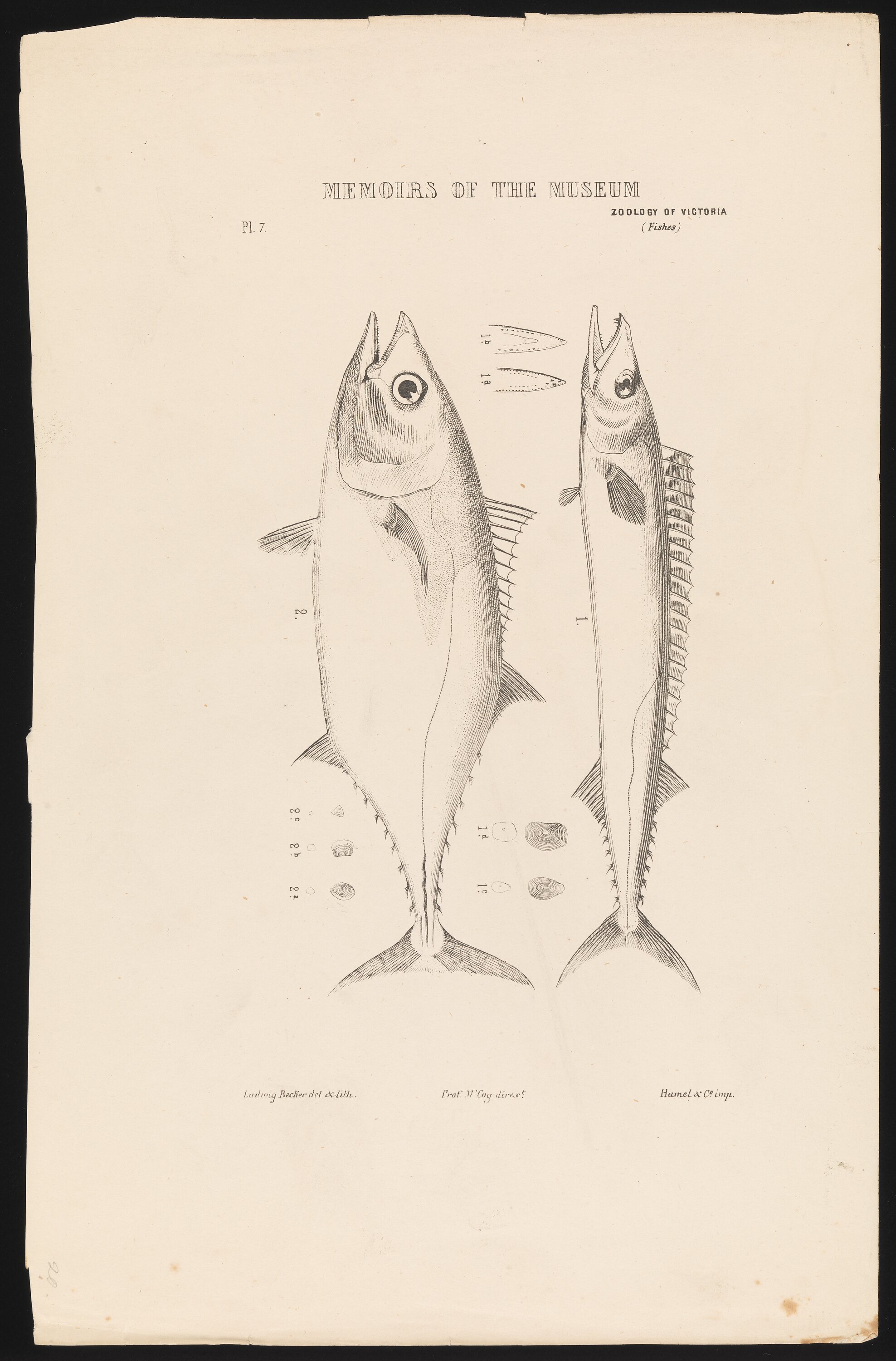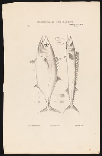 Single colour proof (black) of a Barracouta, Thyrsites atun, and a Southern Bluefin Tuna, Thunnus maccoyii, by Ludwig Becker. This work was commissioned by Frederick McCoy, the first Director of The National Museum of Victoria, for Plate 44, in 'The Prodromus of the Zoology of Victoria; Figures and descriptions of the living species of all classes of the Victoria indigenous animals'. McCoy originally spelt the name of the Barracouta Thersites atun. He also concluded incorrectly that Southern Bluefin Tuna were the same species as Atlantic bluefin tuna, Thunnus thynnus,