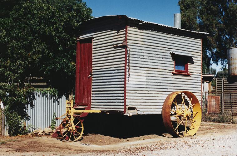 Timber-framed with corrugated-iron cladding. The chassis frame, wheels and forecarriage were adapted from the remains of an old Massey-Harris header harvester. Contents includes iron bed, small fire place & chimney, recycled kerosene tin chest of drawers and dish washing troughs.