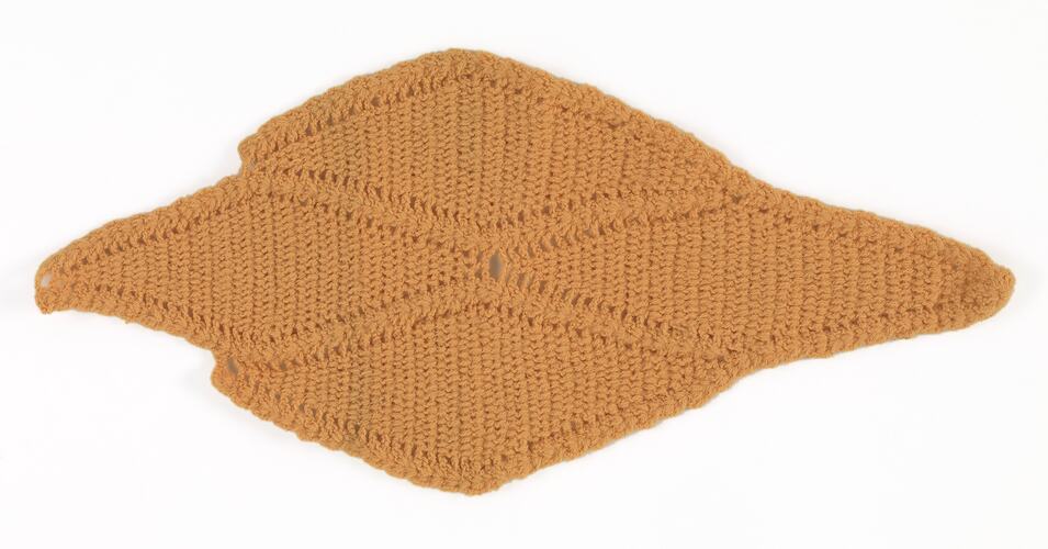 Diamond shaped, flourescent orange coloured crocheted piece.