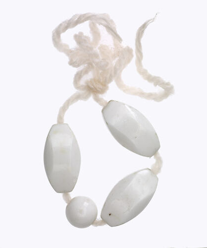 Four white oblong shaped, plastic, faceted beads, on a piece of apricot coloured woollen string.