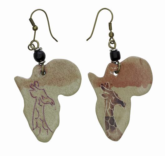 Pair of earrings bought by Nyabana Riek in Nairobi, Kenya as an African keepsake just before coming to Australia in 1995. Nyabana Riek was born in 1977 in southern Sudan. In 1986 when she was only nine years old, she was sent with her older sister Mary to Ethiopia to escape the war. After seven years of living in refugee camps, Nyabana and Mary made the trek from Ethiopia to Kenya. It took three painfully slow years for Australian officials to process their visa applications. Finally, nine years after she began her journey Nyabana arrived in Australia.