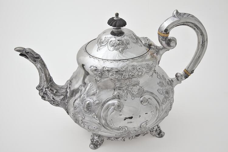 Silver teapot. Spout features an eagle head with open beak at the mouth, and mask at base of spout. Handle is designed with inward curls at top and bottom joins, with ornate thumb rest on top, ivory inserts at top and bottom of handle. Body of teapot is round and heavily floriated with rose designs and features a cartouche on both sides - only one cartouche is inscribed. Lid is hinged and has an ebony, oval shaped handle. Ornate base with four feet. Stamped with hallmarks underneath.