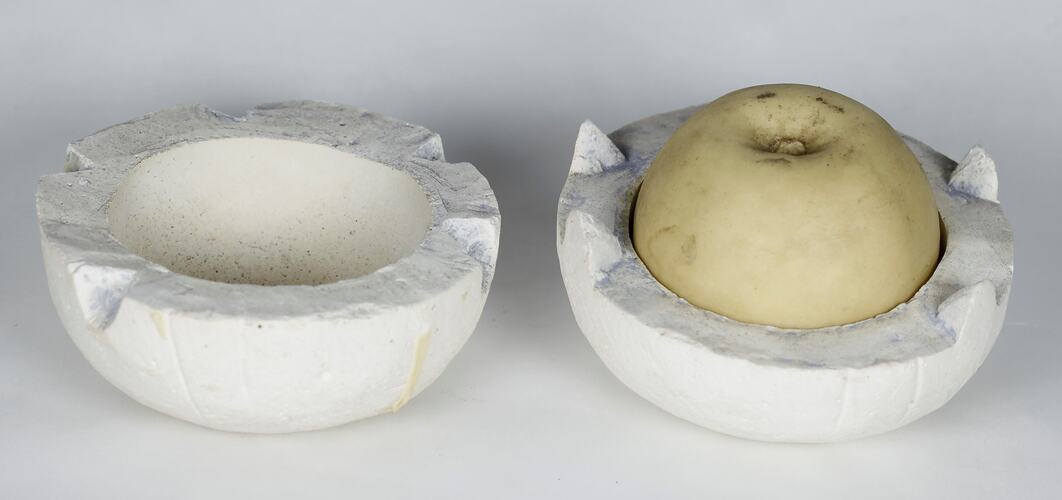 Round, plaster mould in two halves that fit together. Both halves are hollowed in the centre, and lined with yellow-green wax representing the form of an apple.