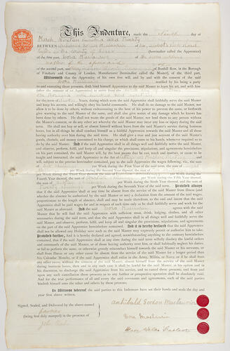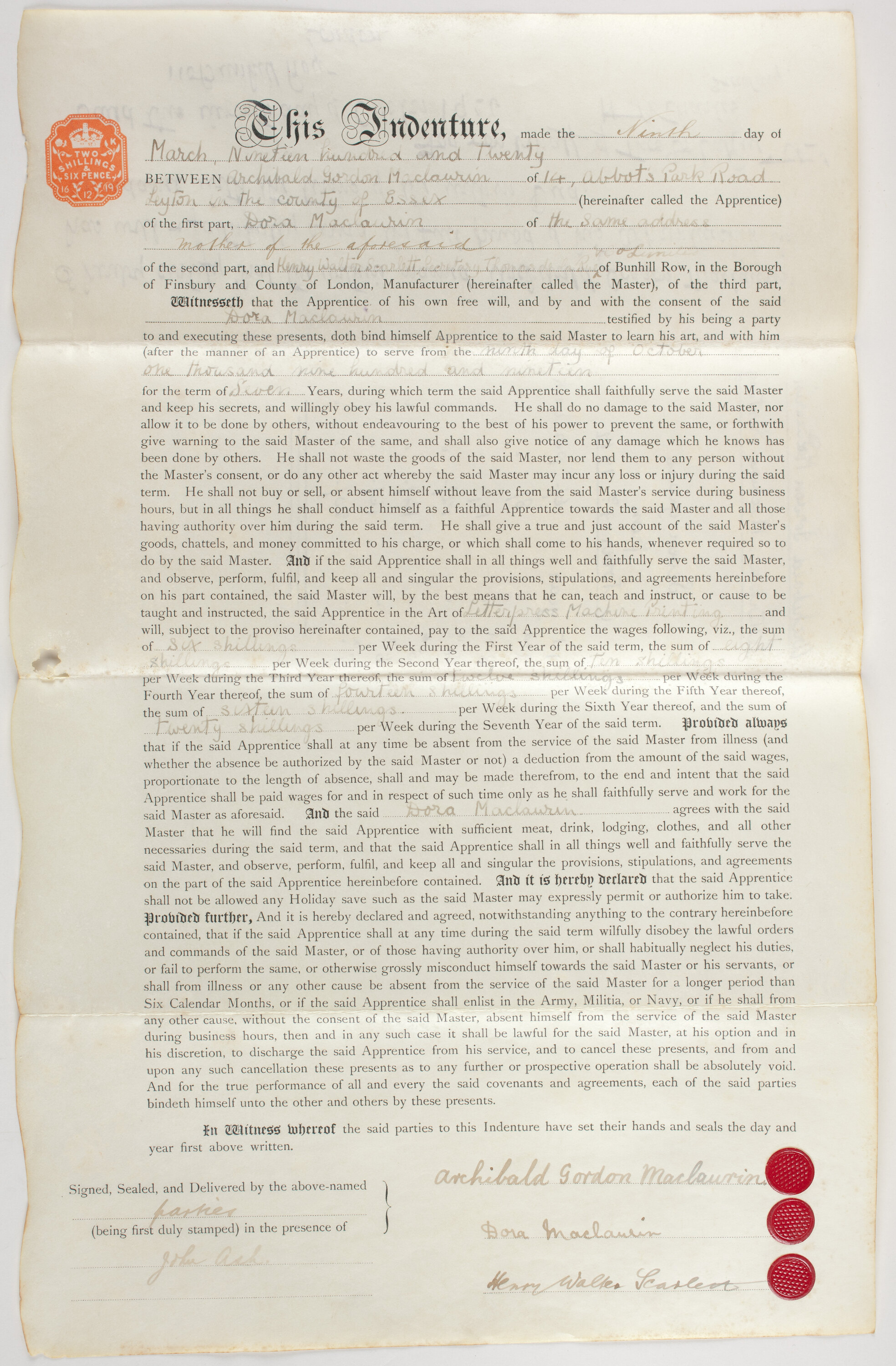 Indenture for Apprenticeship signed between Archibald Gordon Maclaurin and Henry Walter Scarlett, Secretary of Thomas de la Rue of London, for period of 7 years from 9 October 1919. There is an external fold notation regarding successful completion of the apprenticeship on 11 October 1926.