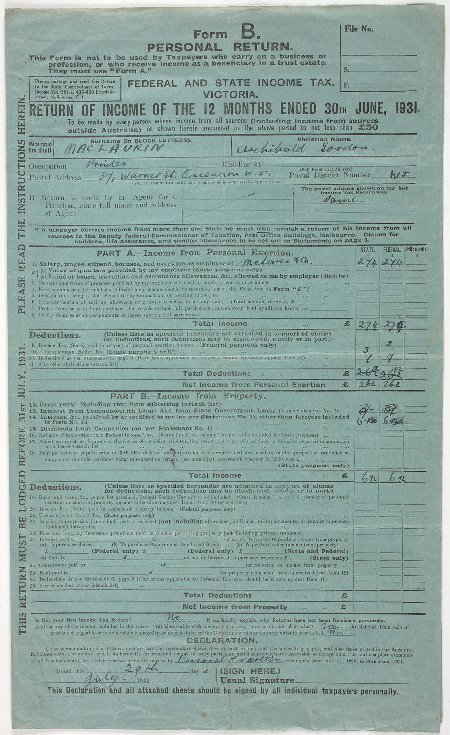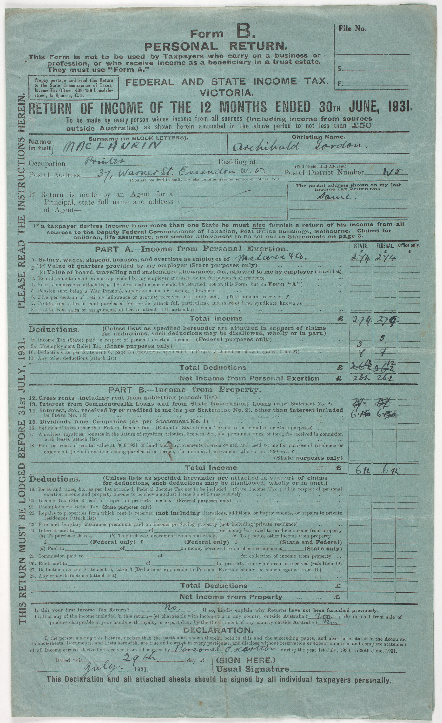 Form B. Personal Return for Federal and State Income Tax for Victoria, completed by AG Maclaurin. It was for return of income of the 12 months ending 30 June 1931.