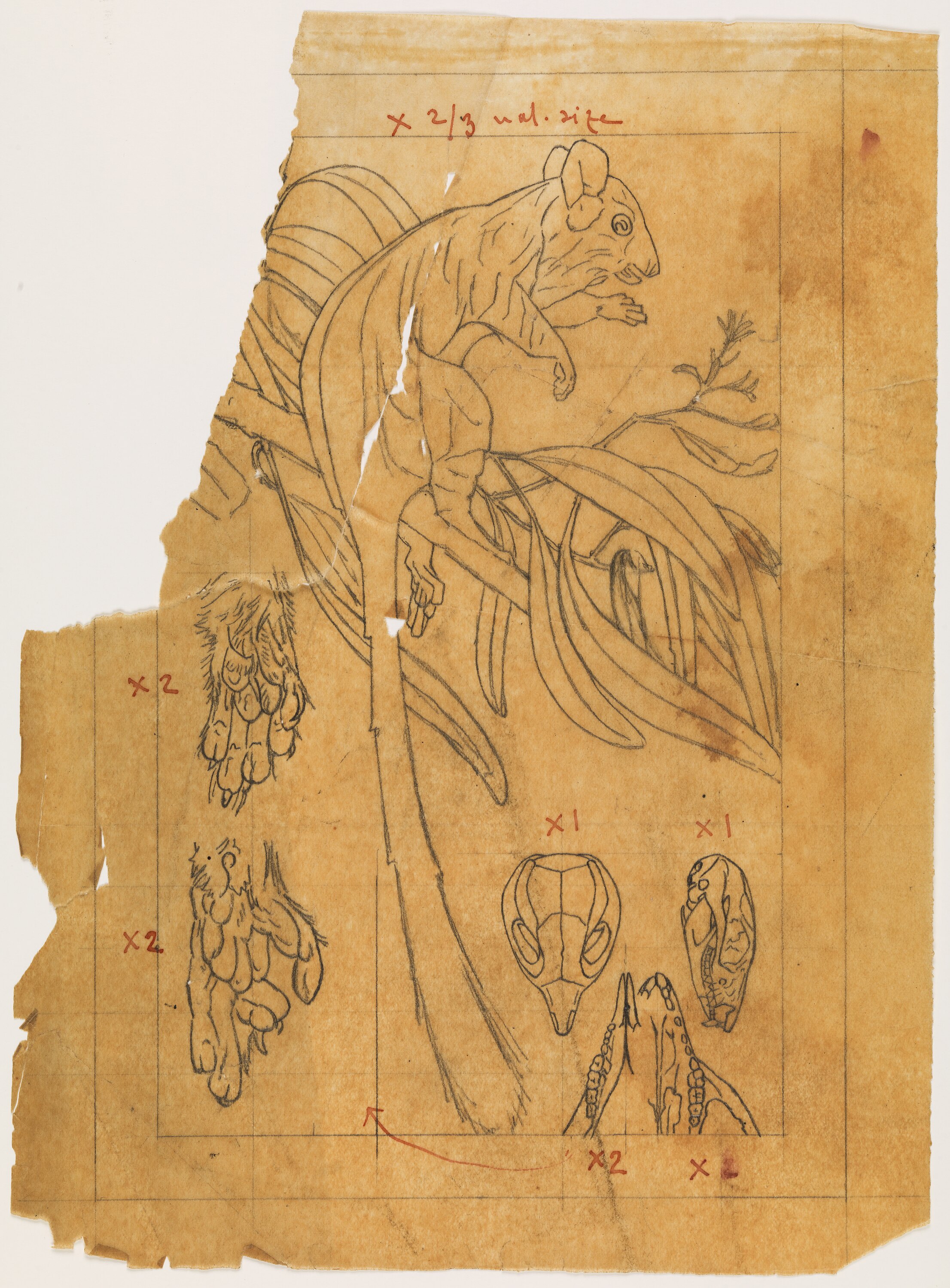 Leadbeater's Possum, Gymnobelideus leadbeateri by J.J Wild (del & lith). Transfer - pencil and red ink on transfer paper, 19cm x 25cm. Transfer finally published as Plate 91 in the Prodromus of Zoology by Frederick McCoy.