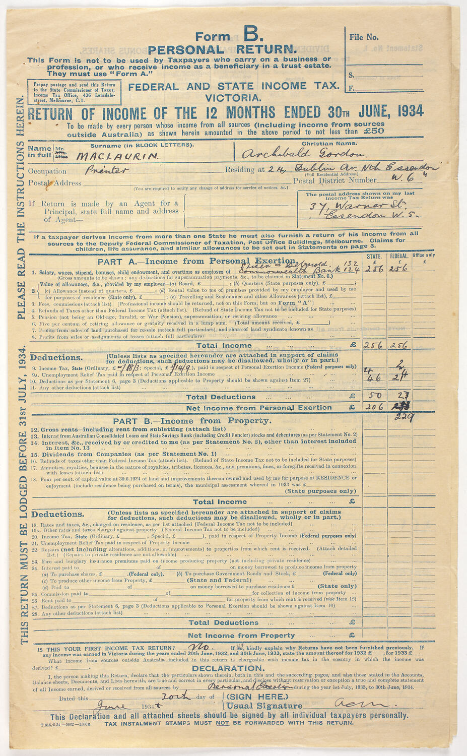 Form B. Personal Return for Federal and State Income Tax for Victoria, completed by AG Maclaurin. It was for return of income of the 12 months ending 30 June 1934.