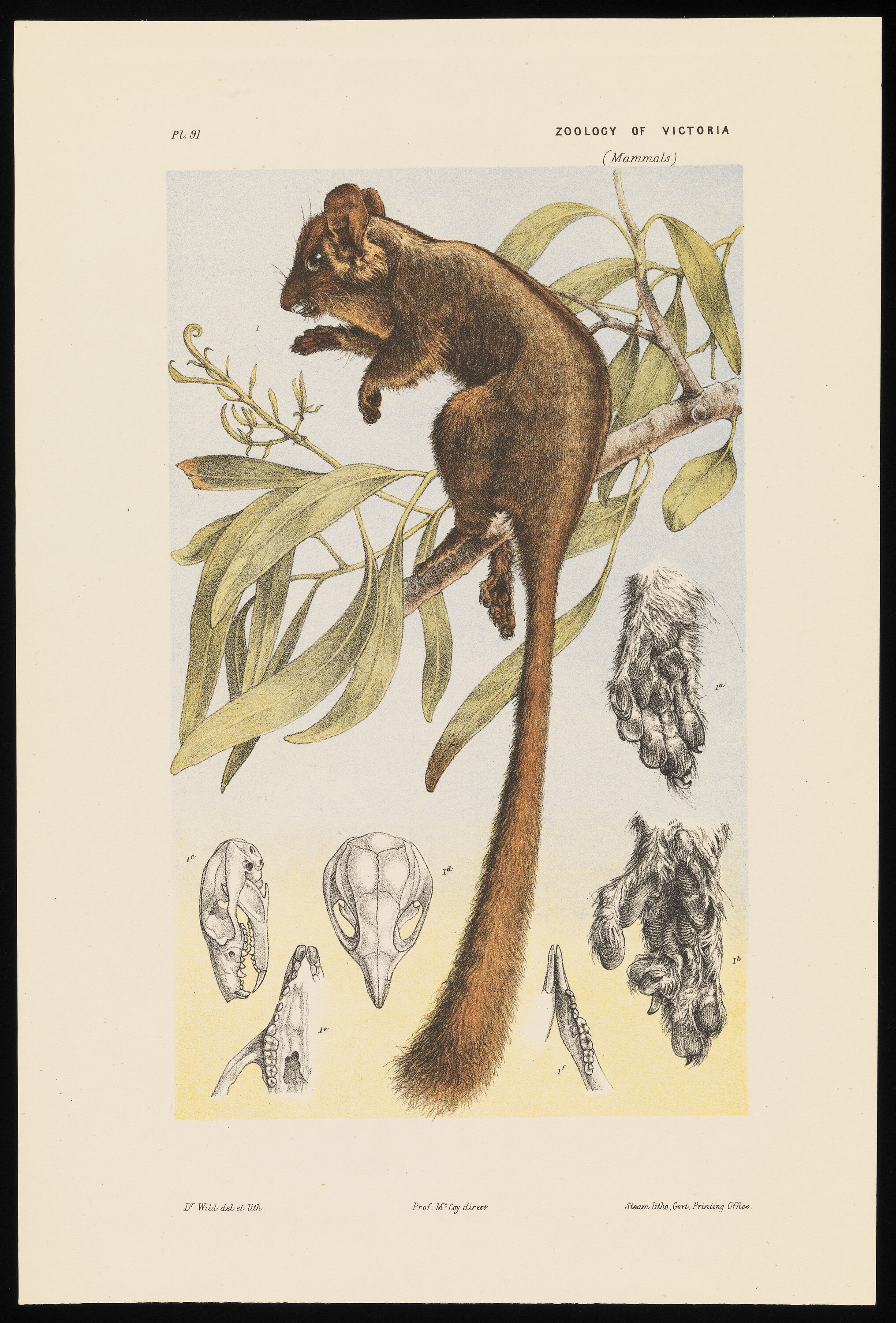 Full colour proof of Leadbeater's Possum, Gymnobelideus leadbeateri, by Dr. John J. Wild, artist and lithographer. This work was commissioned by Frederick McCoy, the first Director of The National Museum of Victoria, for Plate 91 in The Prodromus of the Zoology of Victoria; Figures and descriptions of the living species of all classes of the Victoria indigenous animals.