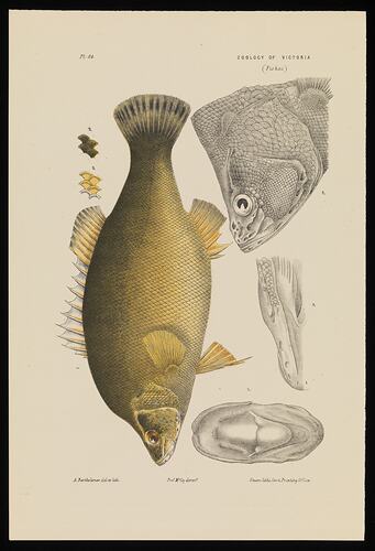 Golden Perch, Macquaria ambigua by Arthur Bartholomew (del & Lith).Lithographic proof - lithographic ink on paper, 20cm x 29cm. Colour proof B finally published as Plate 84 in The Prodromus of the Zoology of Victoria by Frederick McCoy.