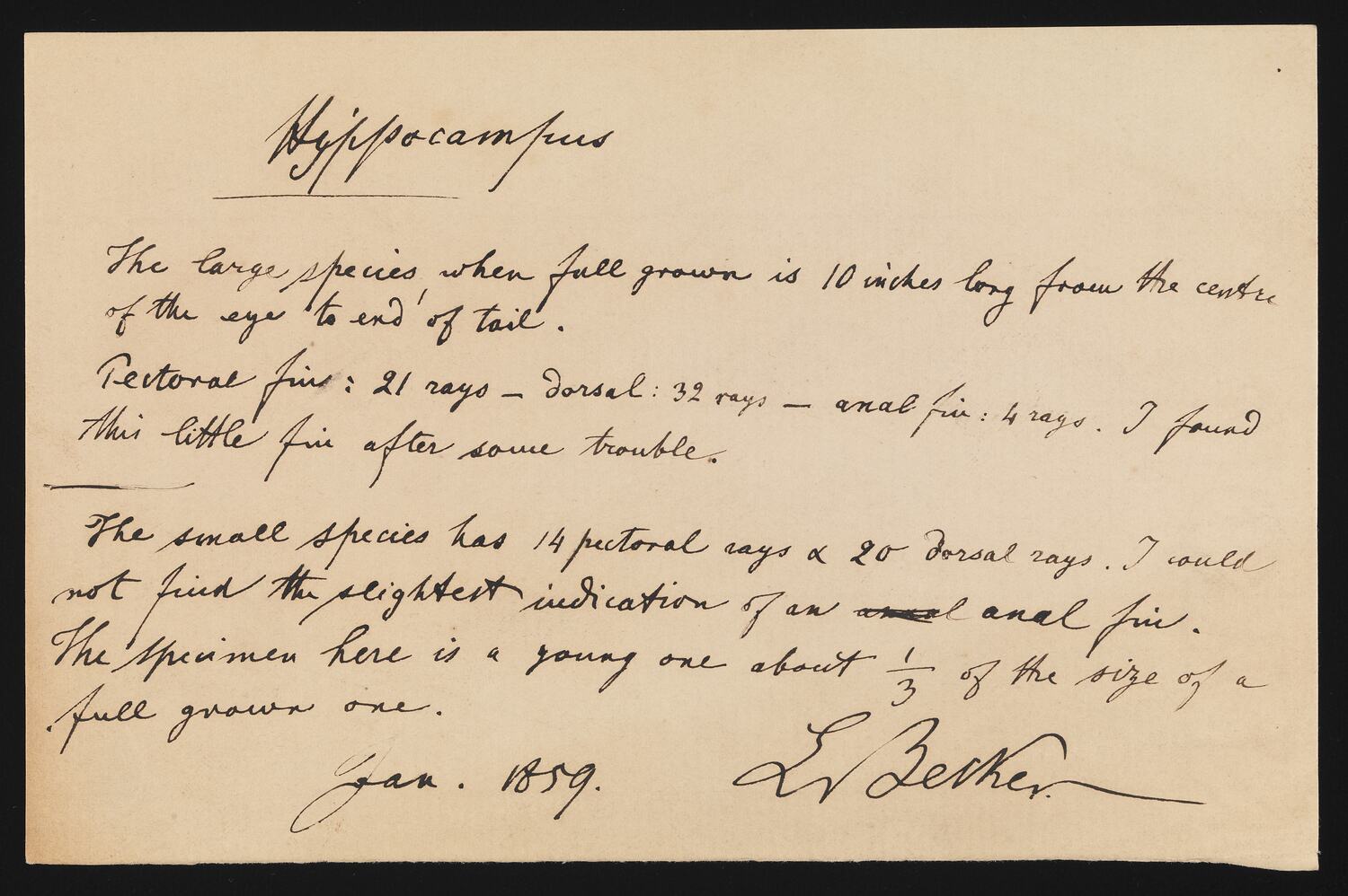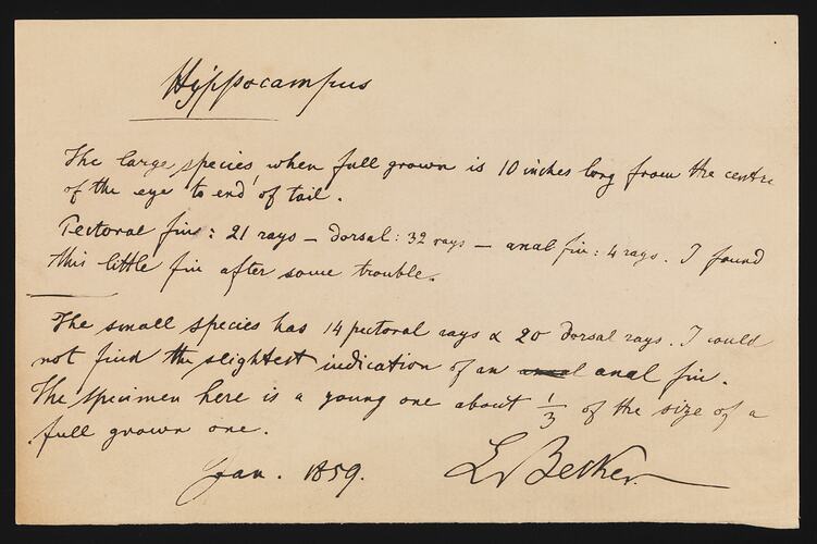 Descriptive notes by Ludwig Becker, January 1859, on the Common Seadragon, Phyllopteryx taeniolatus, & the Shorthead Seahorse, Hippocampus breviceps, associated with the publication of Plate 65 of The Prodromus of Zoology by Frederick McCoy.