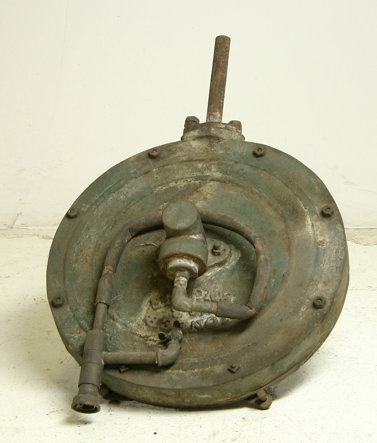 Circular metal body [chamber] with a metal pipe coming out of side. A raised mount is bolted to the centre, with a rubber tubing, metal connectors and valves attached.