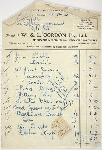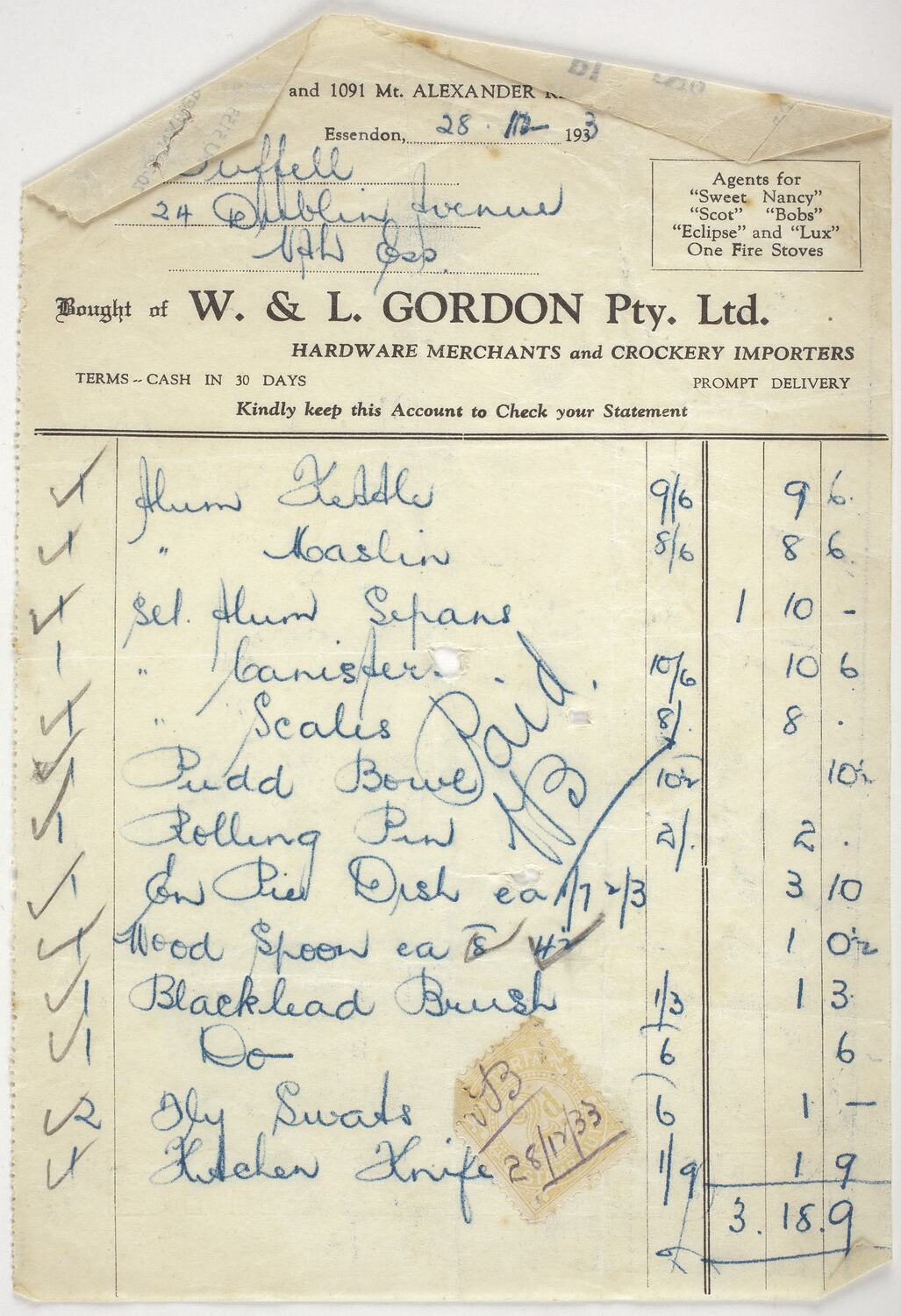 Paper receipt of purchase made out to Miss Duffell from W&L Gordon Pty Ltd, Essendon, dated 28 December 1933, for various domestic kitchen items, at 3 pounds, 18 shillings and 9 pence.